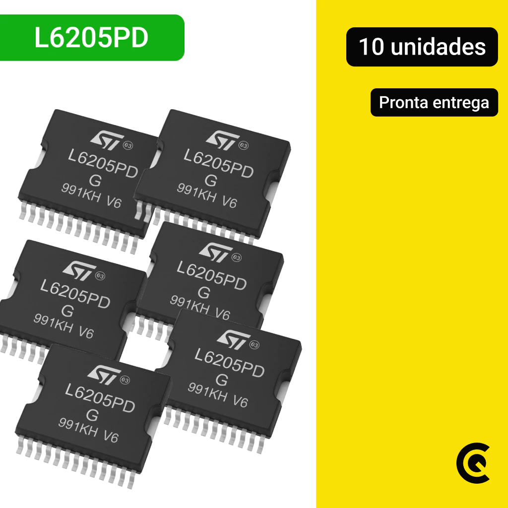 O L6205PD é um driver de motor da STMicroelectronics que integra uma ponte H dupla completa, ideal para controlar motores DC e motores de passo bipolares.