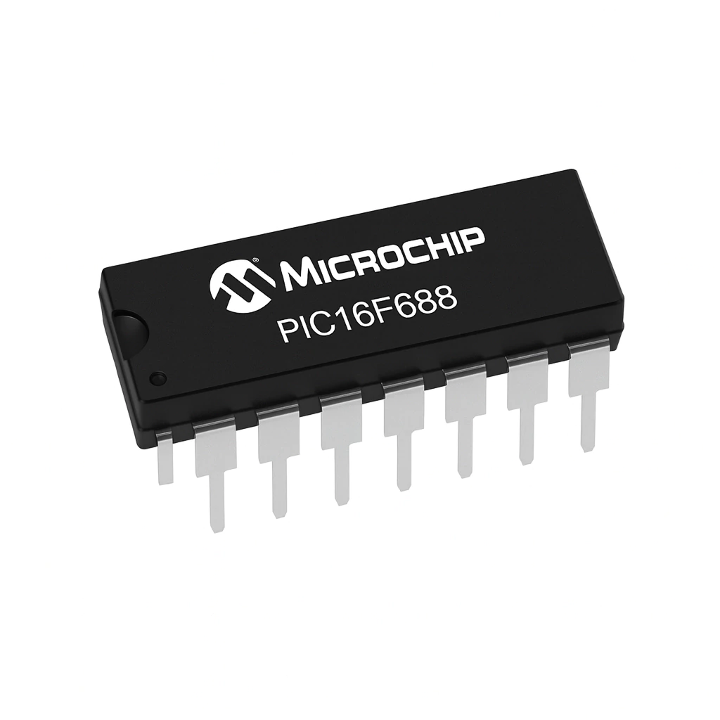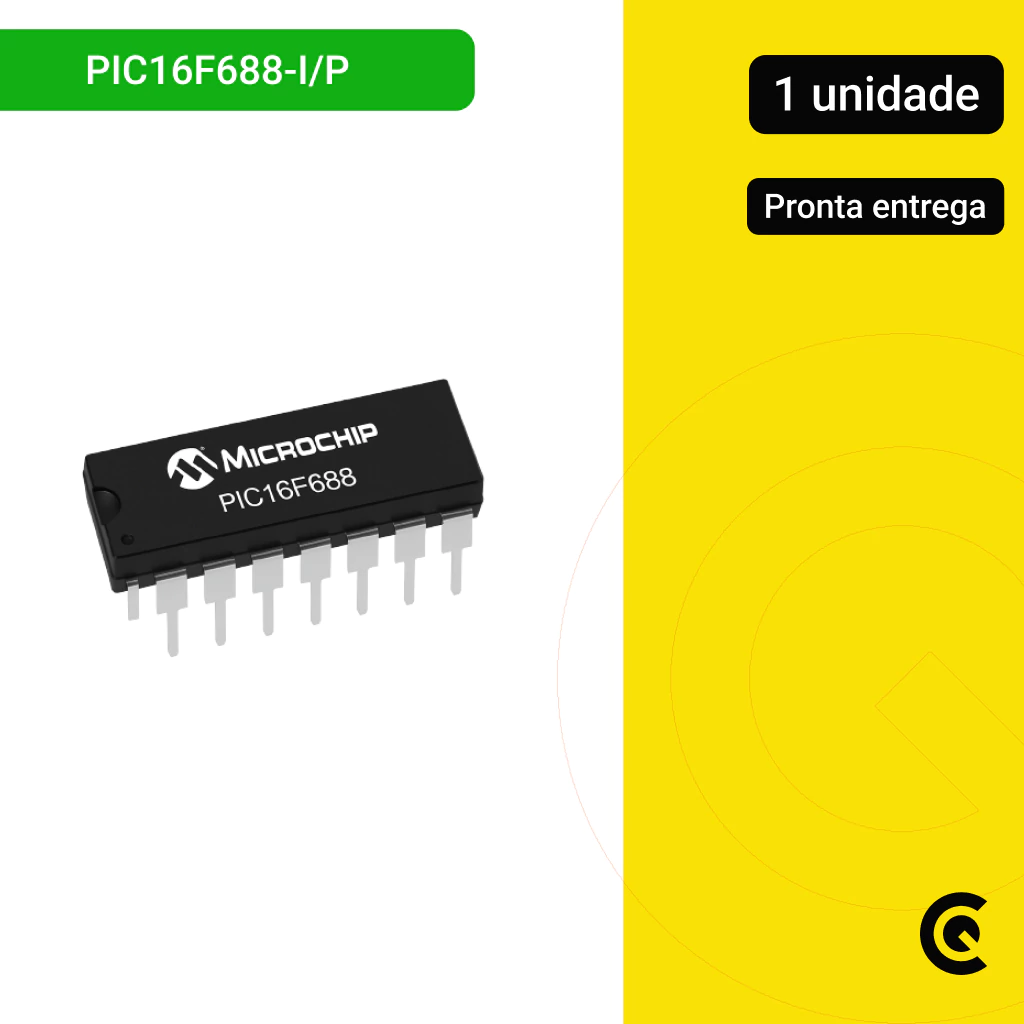 O PIC16F688-I/P da Microchip é um microcontrolador de 8 bits, encapsulamento DIP-14, projetado para aplicações de automação, eletrônica embarcada e projetos educacionais. Conta com 4K de memória Flash programável, 256 bytes de RAM e 256 bytes de EEPROM, além de módulos ADC de 10 bits, comparadores, CCP (Capture/Compare/PWM) e comunicação serial via EUSART.